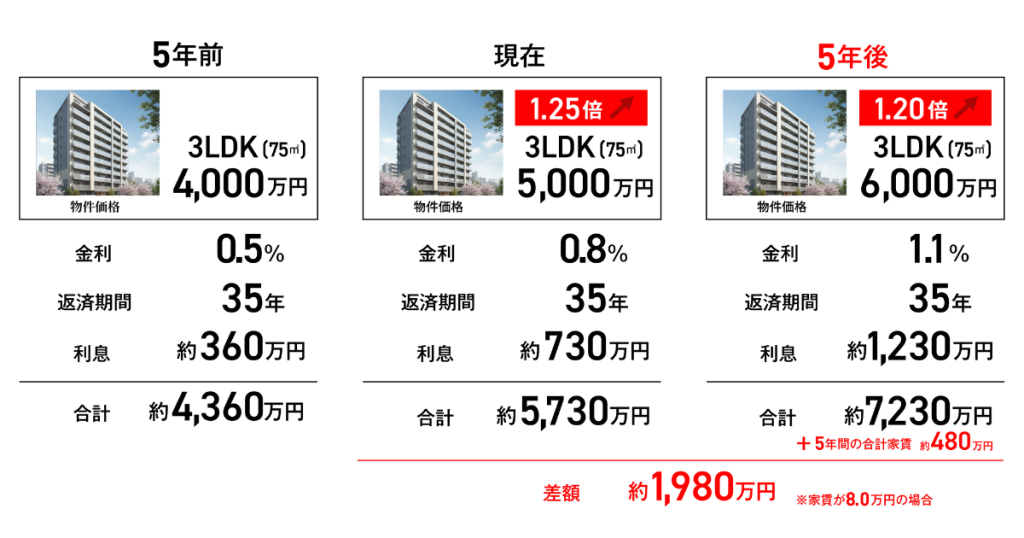 とはいえ、マンション価格の下落を待つのが得策とは言えません。もし金利が上昇したら、いま購入するよりも総支払額が大幅に増加する可能性があるからです。